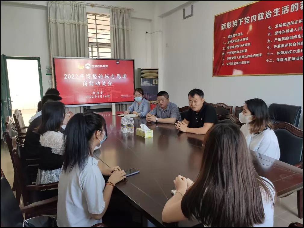 2022年博鳌亚洲论坛将于2022年3月下旬或4月在琼海市举办。为切实保障博鳌亚洲论坛2022年年会志愿服务工作平稳、有序开展,2022年4月14日下午4点半,校团委在行政楼三楼党委会议室召开了博鳌讲解员志愿者岗前动员会,衷心祝愿外国语学院的每一位志愿者都能够圆满顺利完成志愿服务工作。