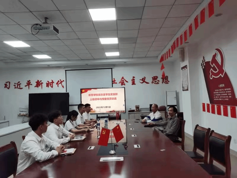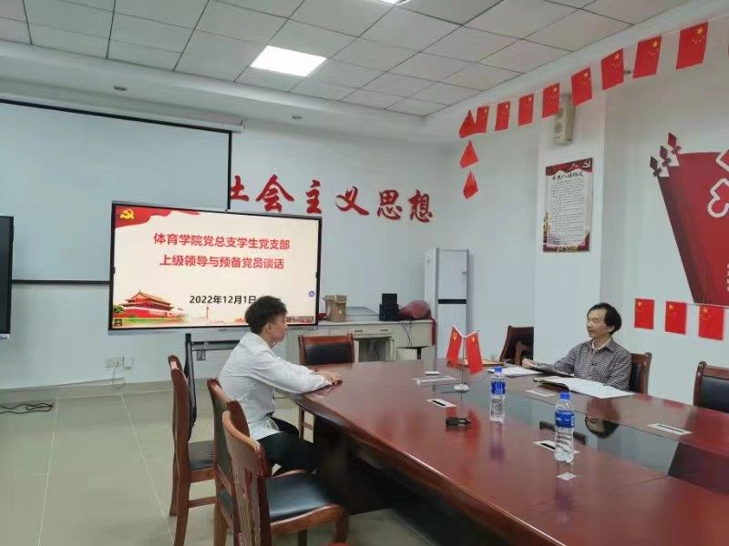2022年12月1日下午3:00,受党委指派,特邀党建组织员王立紫、姚振学两位同志,对体育学院2022年下半年新发展的7位同志进行一对一谈话。谈话内容主要是了解其对党的认识、入党信念、入党动机,思想觉悟和对党的基本知识掌握情况,以及对待入党的态度和决心等,并有针对性地对其进行教育和指导,并审阅相关同志的入党材料。
