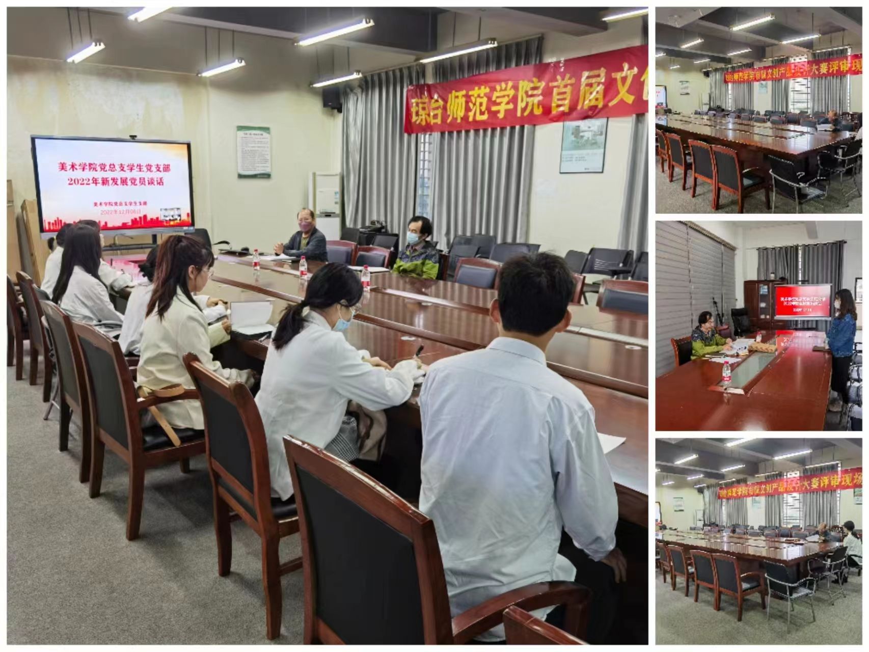 12月7日下午4点半,特邀党建组织员王立紫、姚振学同志与美术学院新发展的13位学生预备党员进行了一对一和集中谈话,审核了新发展党员的相关发展材料。通过一对一谈话,了解预备党员的入党动机,对党的认识,对党章、二十大精神的学习情况等;在集中谈话中,指出了新发展党员们存在的优缺点,向新发展党员们提出了要求和期望。