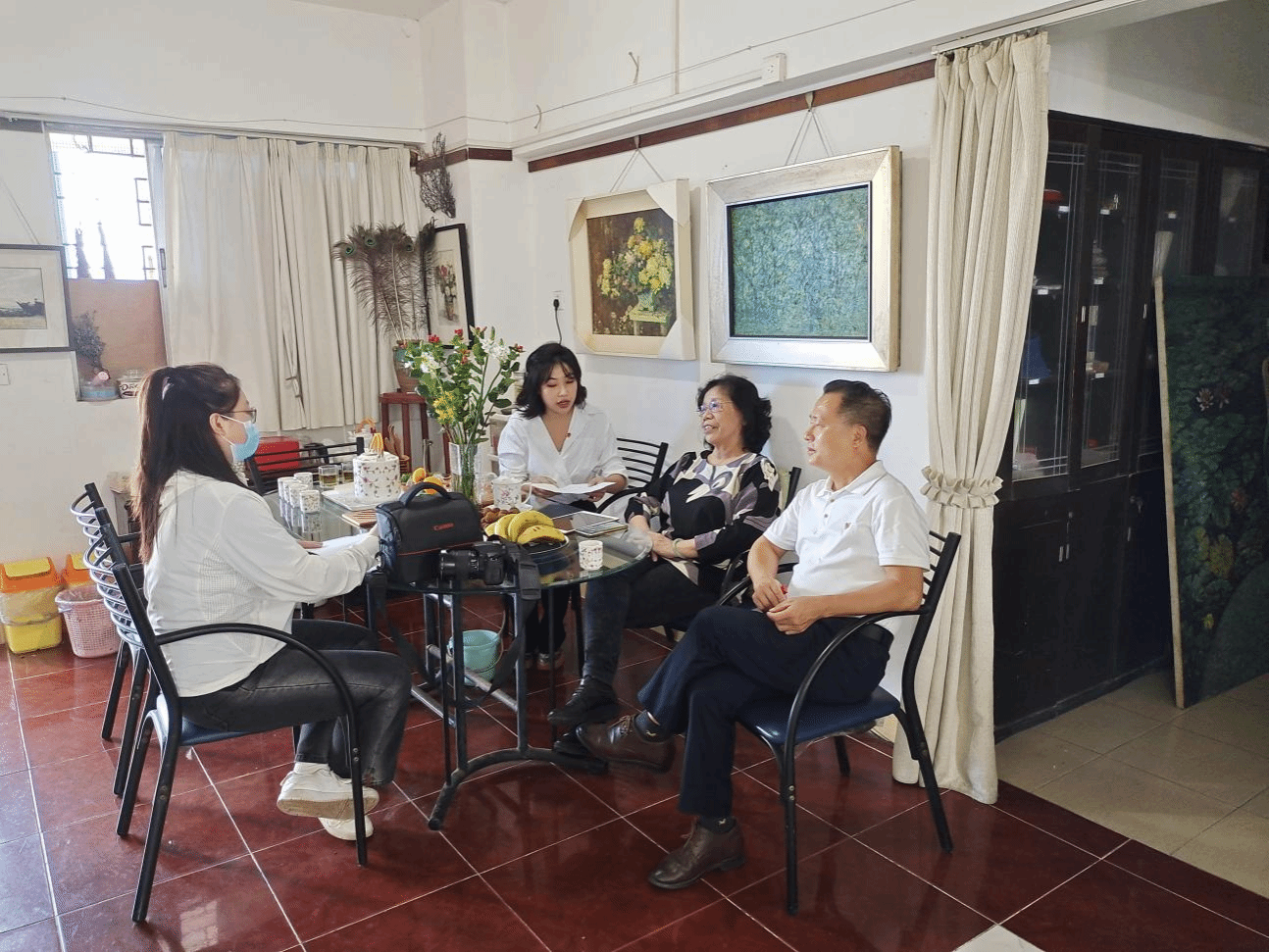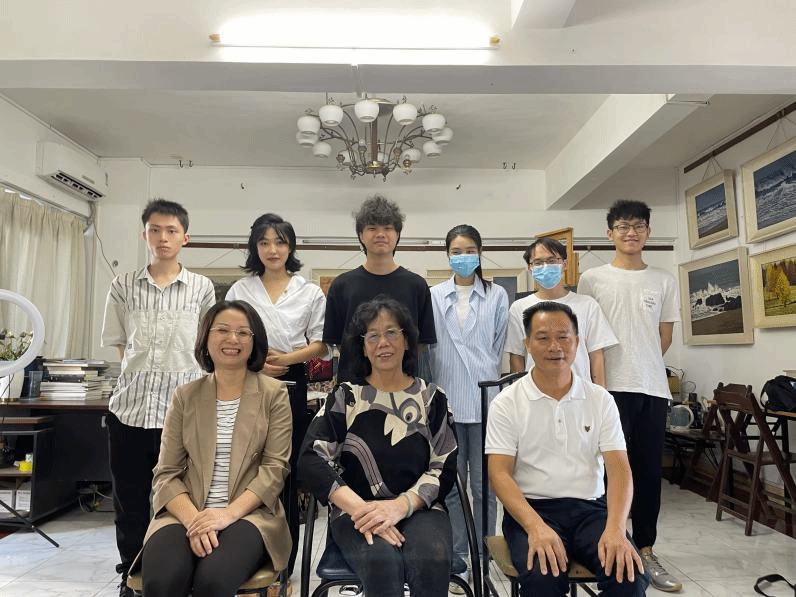 文学院网络与新媒体专业学生对丁女士进行了近两小时的采访。当谈论起她近五十年的艺术生涯,丁女士神采飞扬,绘声绘色地向学生们讲述了她油画创作的故事。丁女士还特别提到了《琼花▪党代表》与《古有花木兰,今有娘子军》两幅红色题材画作,她表示这两幅作品是献给我们伟大的党、琼崖革命烈士。丁孟芳女士缅怀历史,站在新的历史起点,饱含激情地用画笔描绘过去琼崖革命的光辉历史。为了提高画作的真实感,丁女士在创作之前,还走遍琼崖红色景区进行采风,并以娘子军——琼花为原型进行创作,希望能通过作品体现出当时革命斗争的不易和展现娘子军独有的女性的强大无畏精神。