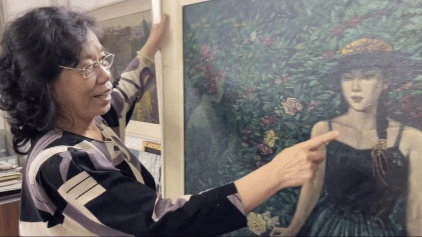 丁孟芳女士正在展示画作