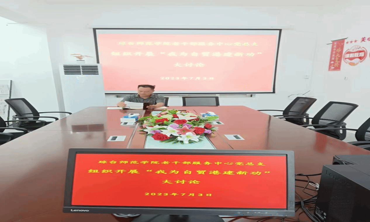 7月3日,一场“我为自贸港建新功”的大讨论在老干部服务中心多媒体会议室展开。老干部服务中心全体党员采用线上围绕“推动琼台师范学院发展 助力自贸港建设”进行热烈讨论,进一步推动主题教育走深走实。